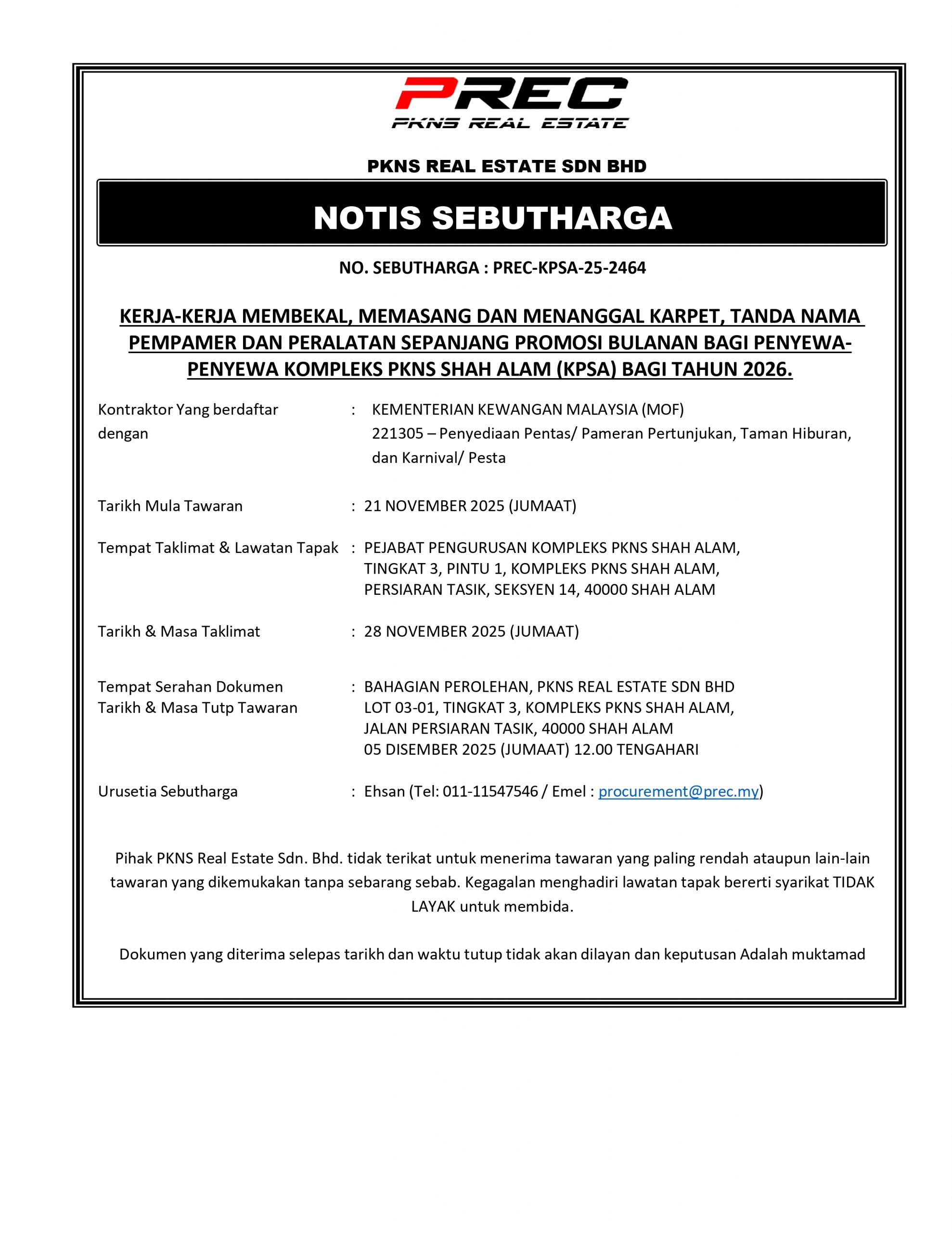 Satu lagi projek di bawah PKNS Real Estate Sdn Bhd (PREC) bagi Kerja-Kerja Penyediaan Kelengkapan Dan Membekal Bubur Lambuk Kampung Baru Untuk Festival Ramadan Selangor 2017 (FESTIRA’17) Dan Lain-Lain Kerja Berkaitan Di SACC Mall, Kompleks PKNS Shah Alam Dan Kompleks PKNS Bangi, Selangor Darul Ehsan.