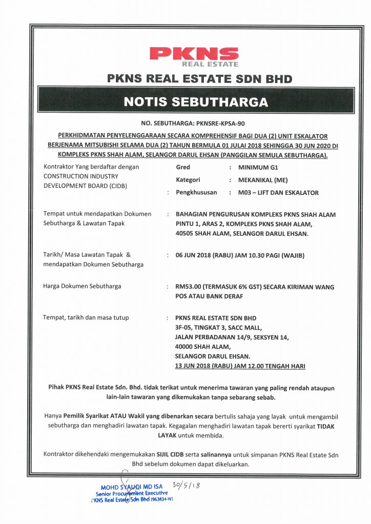 TERKINI 30 MEI 2018: (PANGGILAN SEMULA) – Perkhidmatan penyelenggaraan secara komprehensif bagi DUA (2) unit eskalator berjenama Mitsubishi selama DUA (2) tahun bermula 01 Julai 2018 sehingga 30 Jun 2020 di Kompleks PKNS Shah Alam, Selangor Darul Ehsan